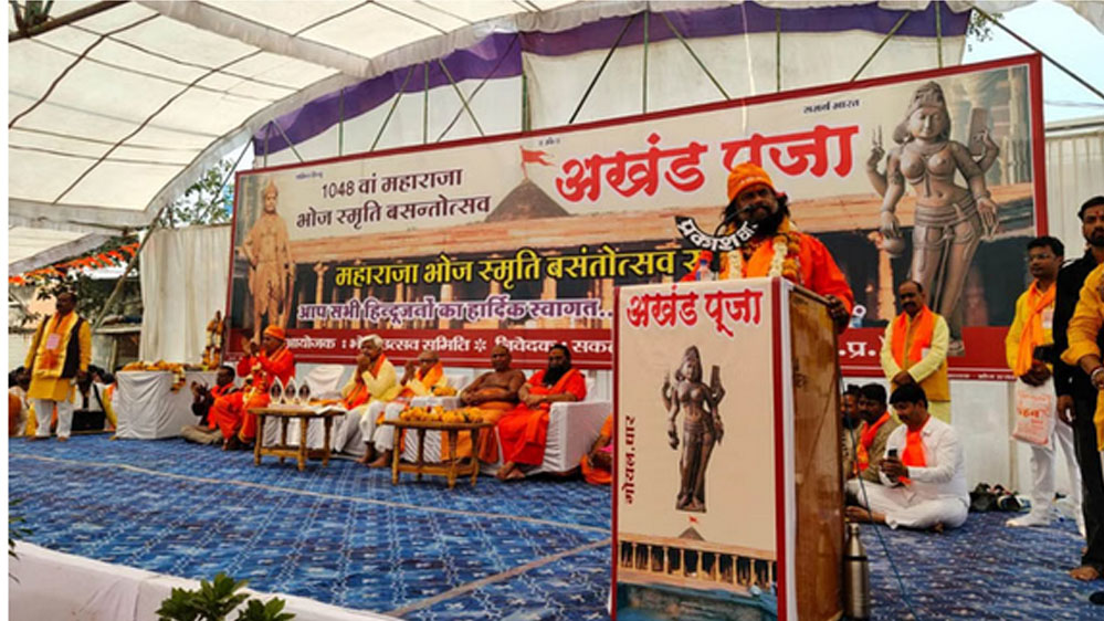 वसंत पंचमी के मौके पर राजा भोज वसंतोत्सव समिति ने शुक्रवार को यहां एक धर्मसभा का आयोजन किया। इस दौरान वक्ताओं ने कहा कि वर्ष 2034 में भोजशाला के निर्माण को एक हजार साल पूरे हो रहे हैं। इस बीच भोजशाला का मुकदमा हमें जीतना है और यहां मां सरस्वती के भव्य मंदिर का निर्माण करना है। विश्व हिंदू परिषद के राष्ट्रीय अध्यक्ष आलोक कुमार ने कहा कि लंदन के एक म्यूजियम में मां सरस्वती की मूर्ति है। उसे देश में वापस लाना है। भोजशाला मामले में जो याचिका लगी है उसका मुकदमा जीतना है।